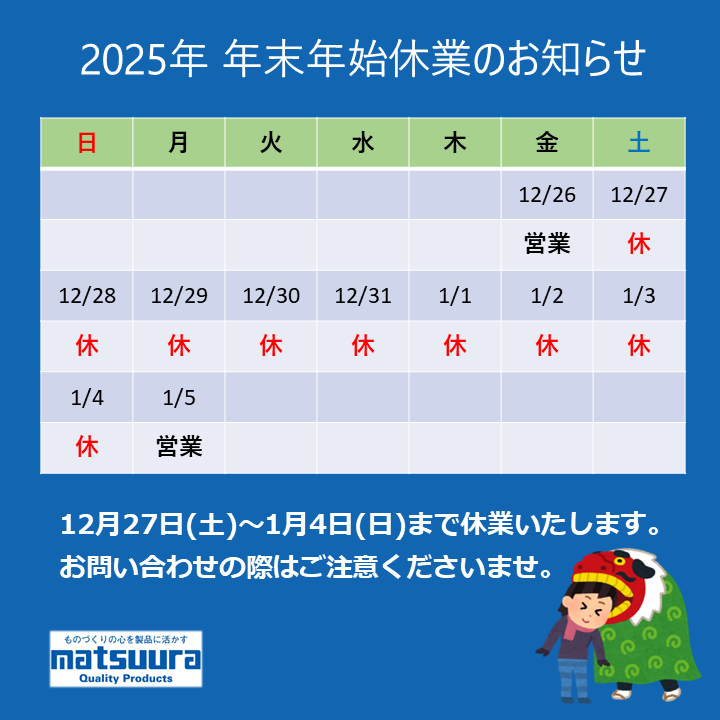 株式会社松浦製作所は年末年始休業とさせていただきます。